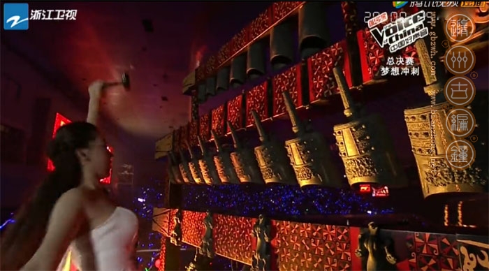 2014年10月7日,中國(guó)好聲音第三季北京總決賽在北京首都體育館成功舉辦,開(kāi)場(chǎng)時(shí)一位身穿白衣的美麗女孩敲擊編鐘發(fā)出美妙的好聲音,這套編鐘就是由隨州市古編鐘文化發(fā)展有限公司制作的22件曾侯乙編鐘。